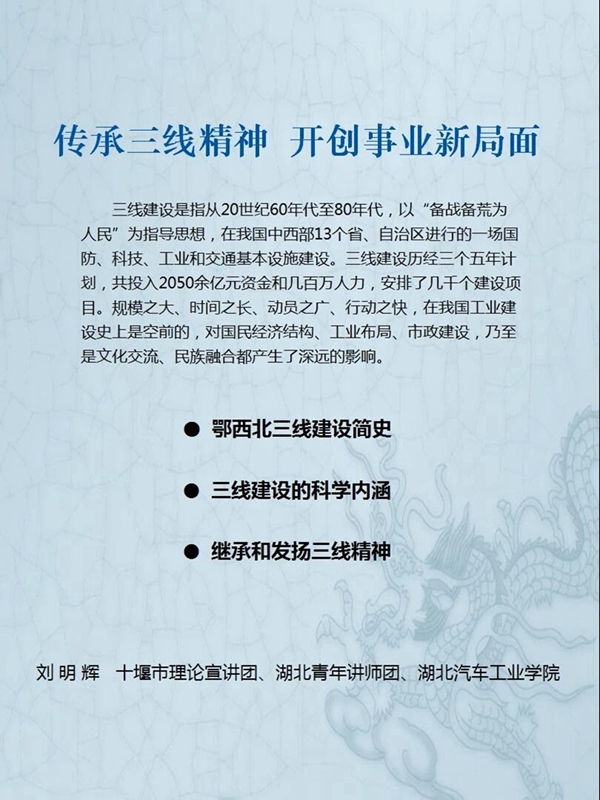 在《传承三线精神开创事业新局面》中,刘明辉对鄂西北三线建设历史作了简要的回顾和梳理,结合鄂西北三线建设的历史进程和辉煌成就,对“艰苦创业、无私奉献、团结协作、勇于创新”的三线精神进行了本土化的解读。在对三线精神进行阐释的基础上,他建议,十堰在建成“现代新车城、绿色生态市”的进程中,要大力弘扬三线精神,坚韧不拔、攻坚克难、团结奋进、众志成城、解放思想、敢闯敢试,在坚持创新驱动、区域协调、扩大内需、深化改革、绿色发展、扩大实体经济、推动乡村振兴等方面着力,将十堰建设成为区域性中心城市。